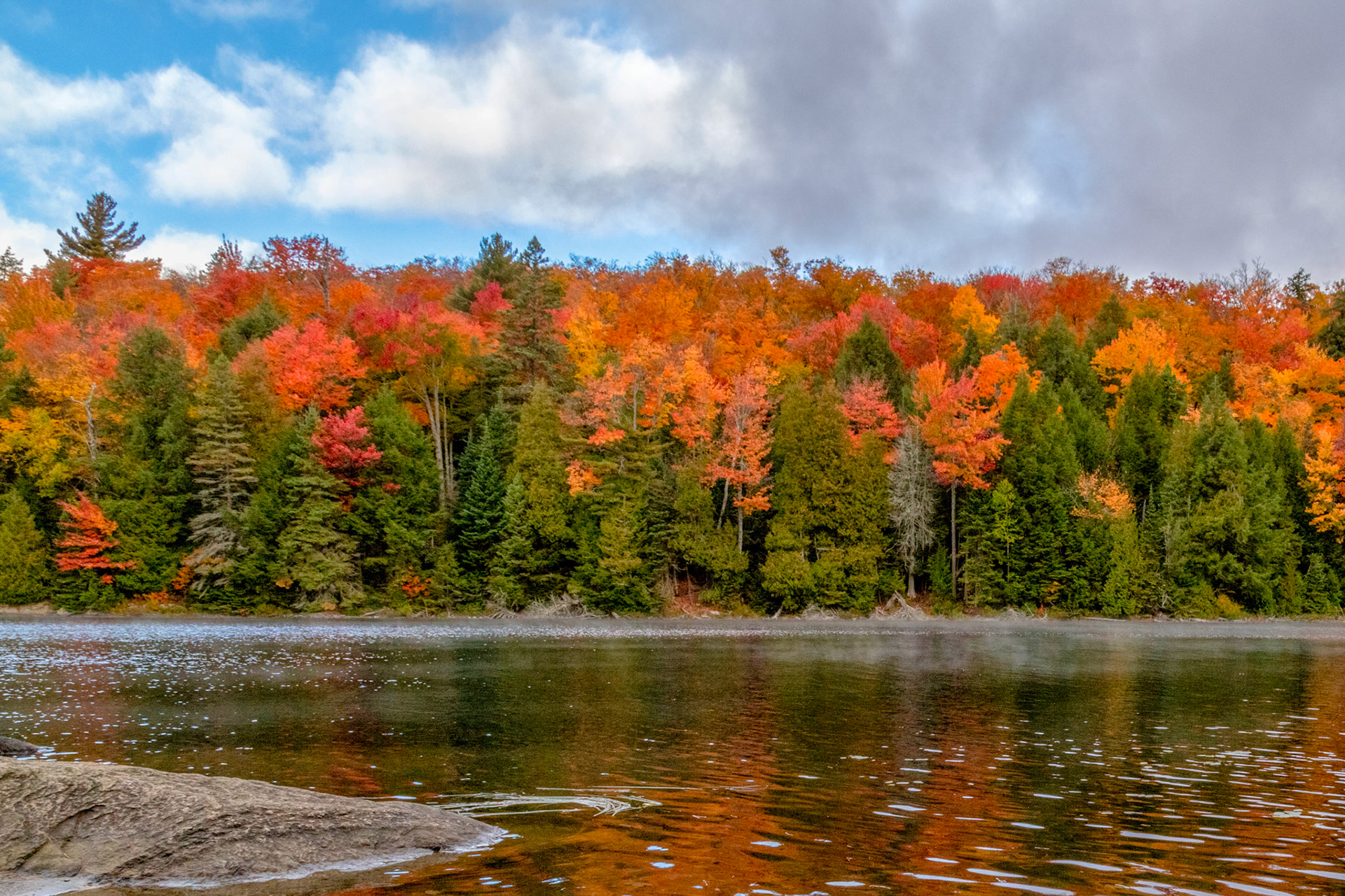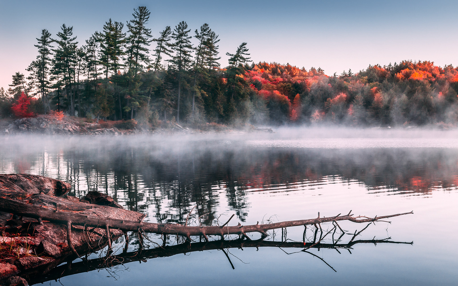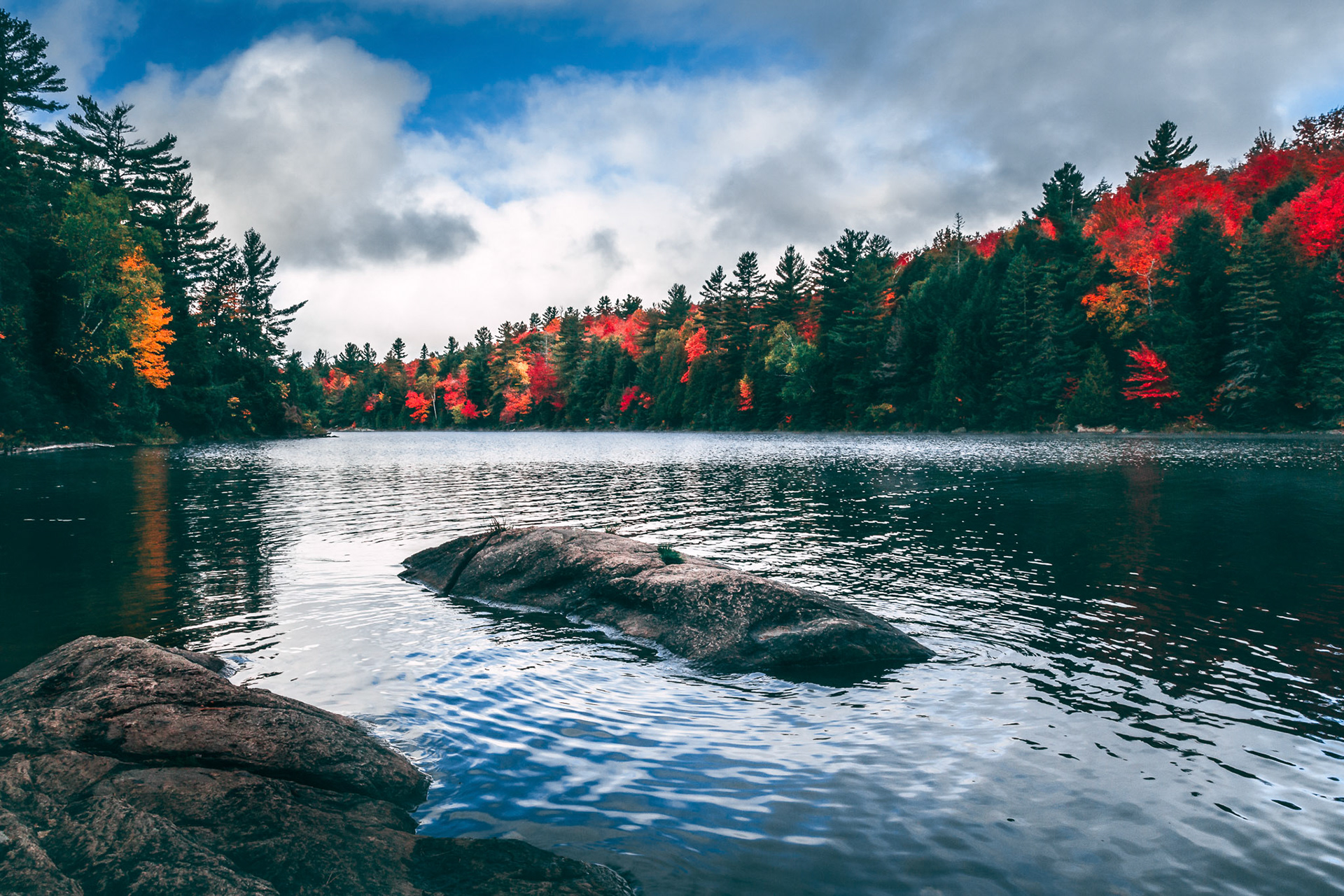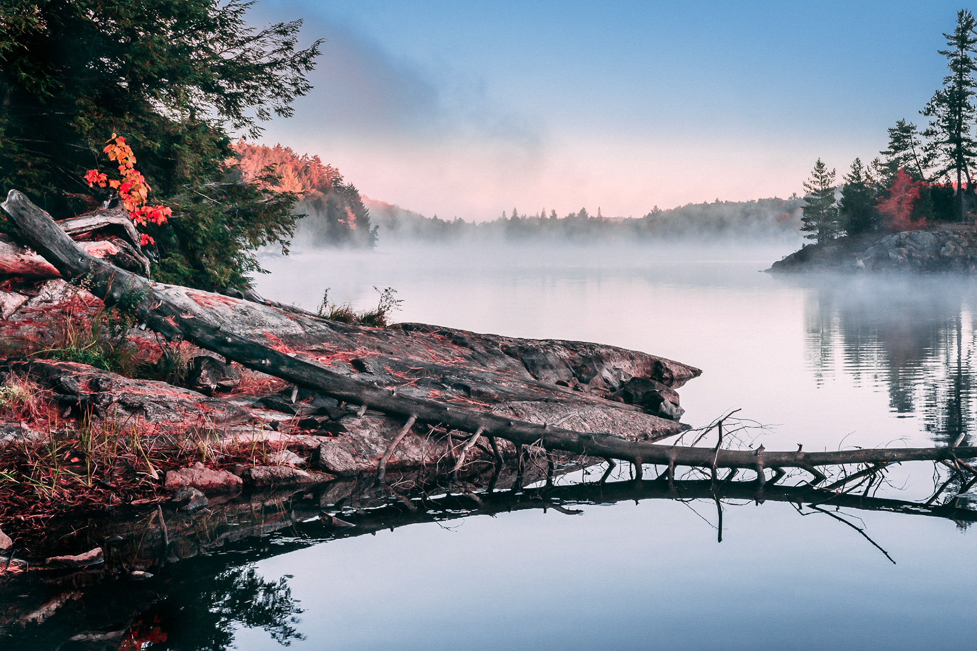 Fall colors in Algonquin Provincial Park with rocks in the foreground and a slight mist on the water
