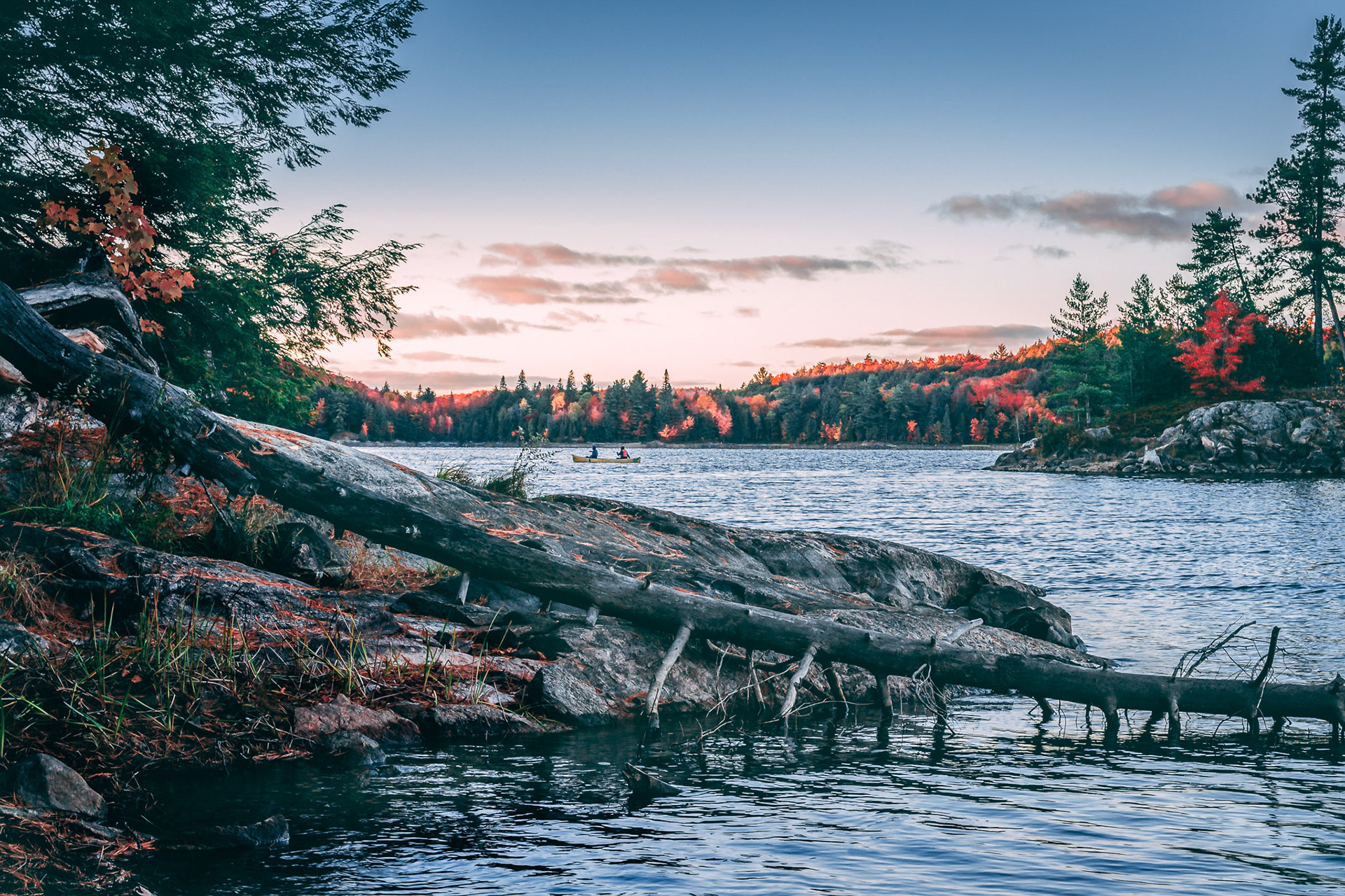 Fallen tree on Ragged Lake, with couple in a canoe surrounded by autumn tree colours. Captured at Algonquin Provincial Park on 09 Oct, 2016 by Michael Closson.