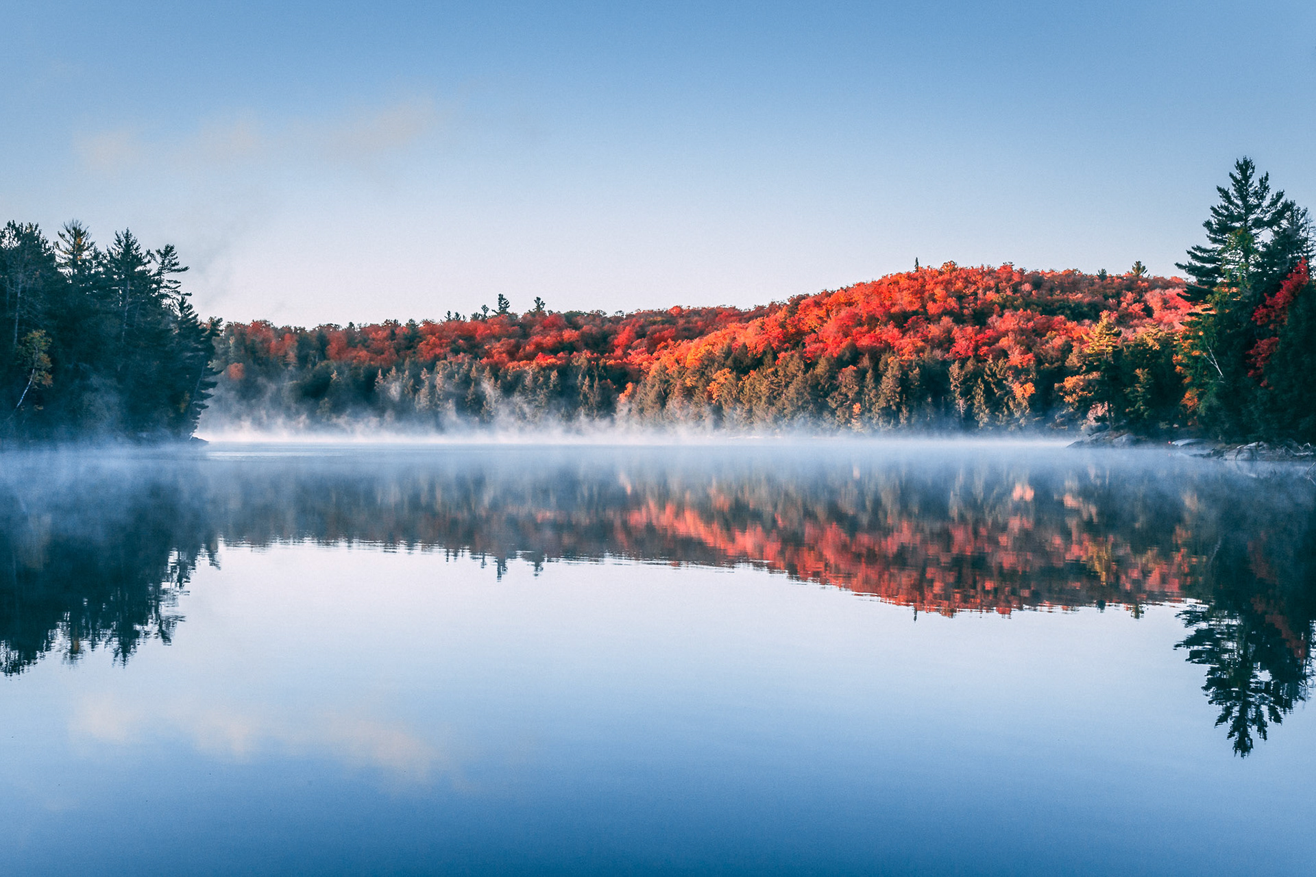 Morning reflection and mist on Ragged Lake, with fall colours. Captured at Algonquin Provincial Park on 10 Oct, 2016 by Michael Closson.