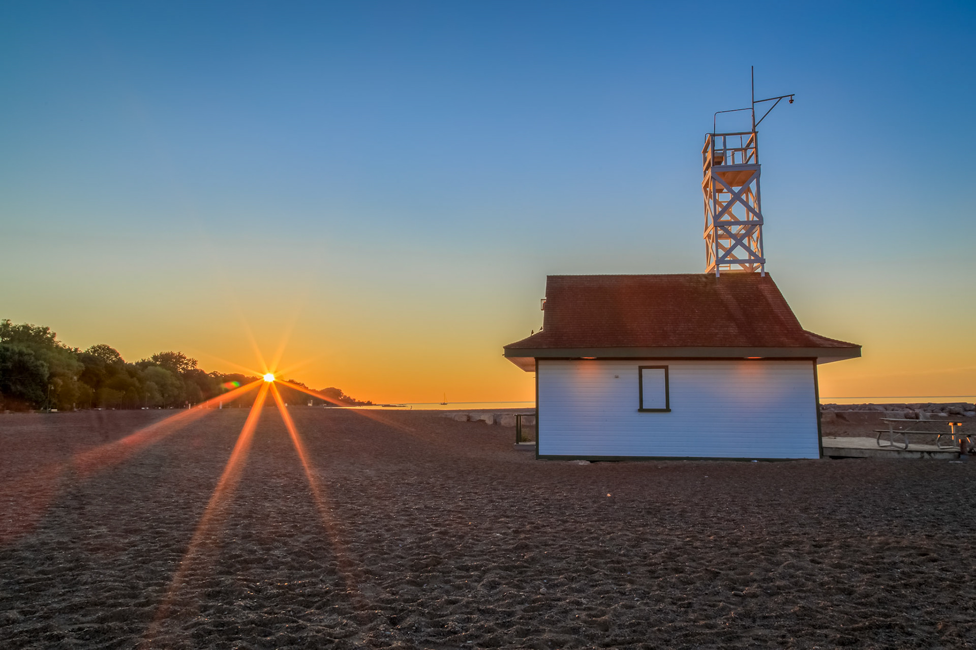 Sunrise at the Leuty Lifeguard Station, with sun star - near Woodbine Beach, Toronto